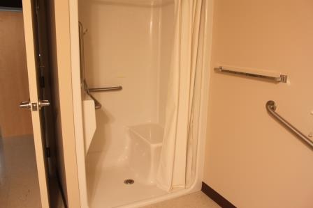 - la salle de bain privée avec baignoire, douche et barres de sécurité